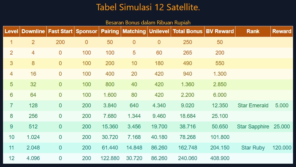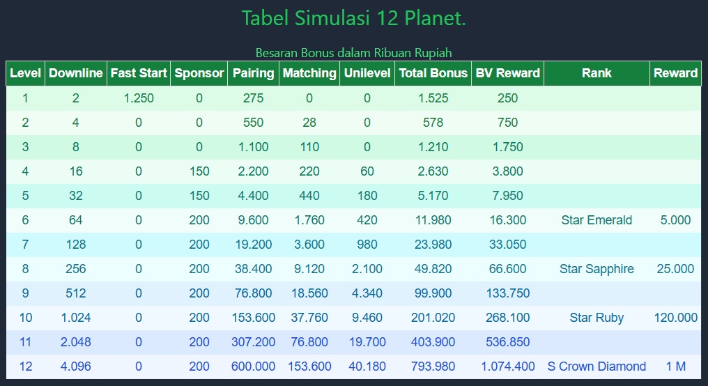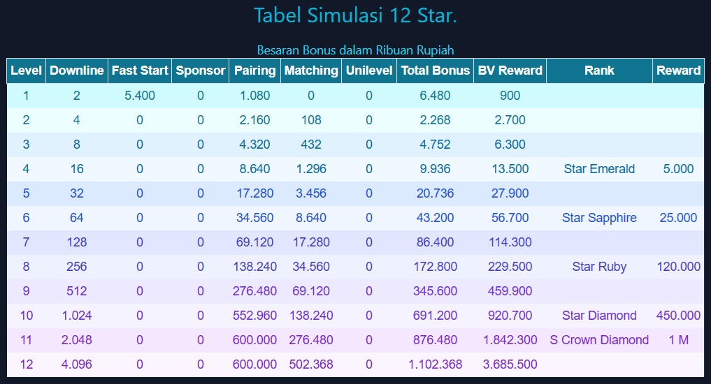 Di bawah ini adalah tabel simulasi perkembangan bonus seorang member selama 12 periode bila terjadi duplikasi kelipatan 2 setiap periodenya. Simulasi bonus ini menghitung bonus dari penambahan member baru dan repeat order hanya dari tupo sebesar 50 BV untuk menambah masa aktif.